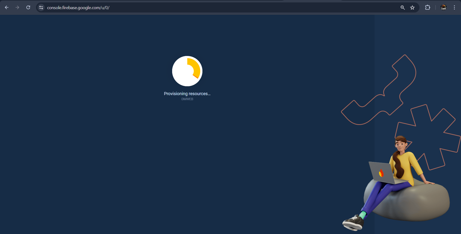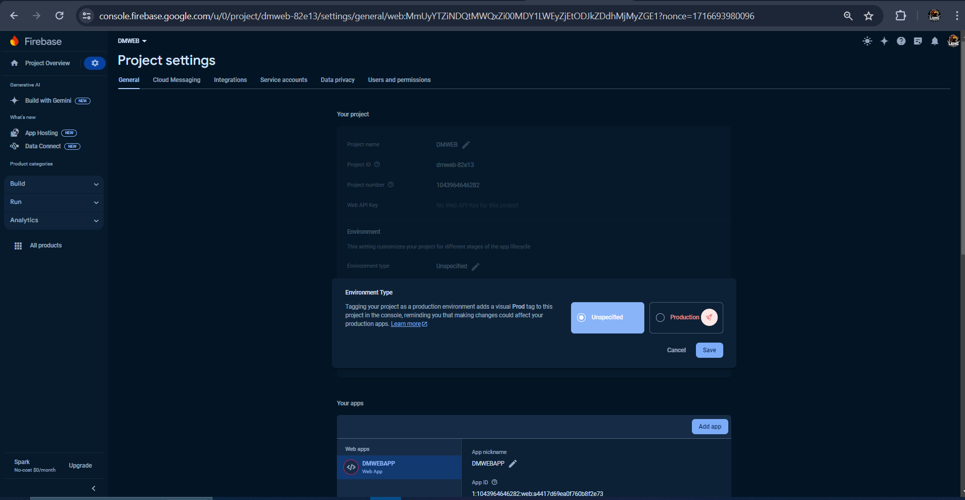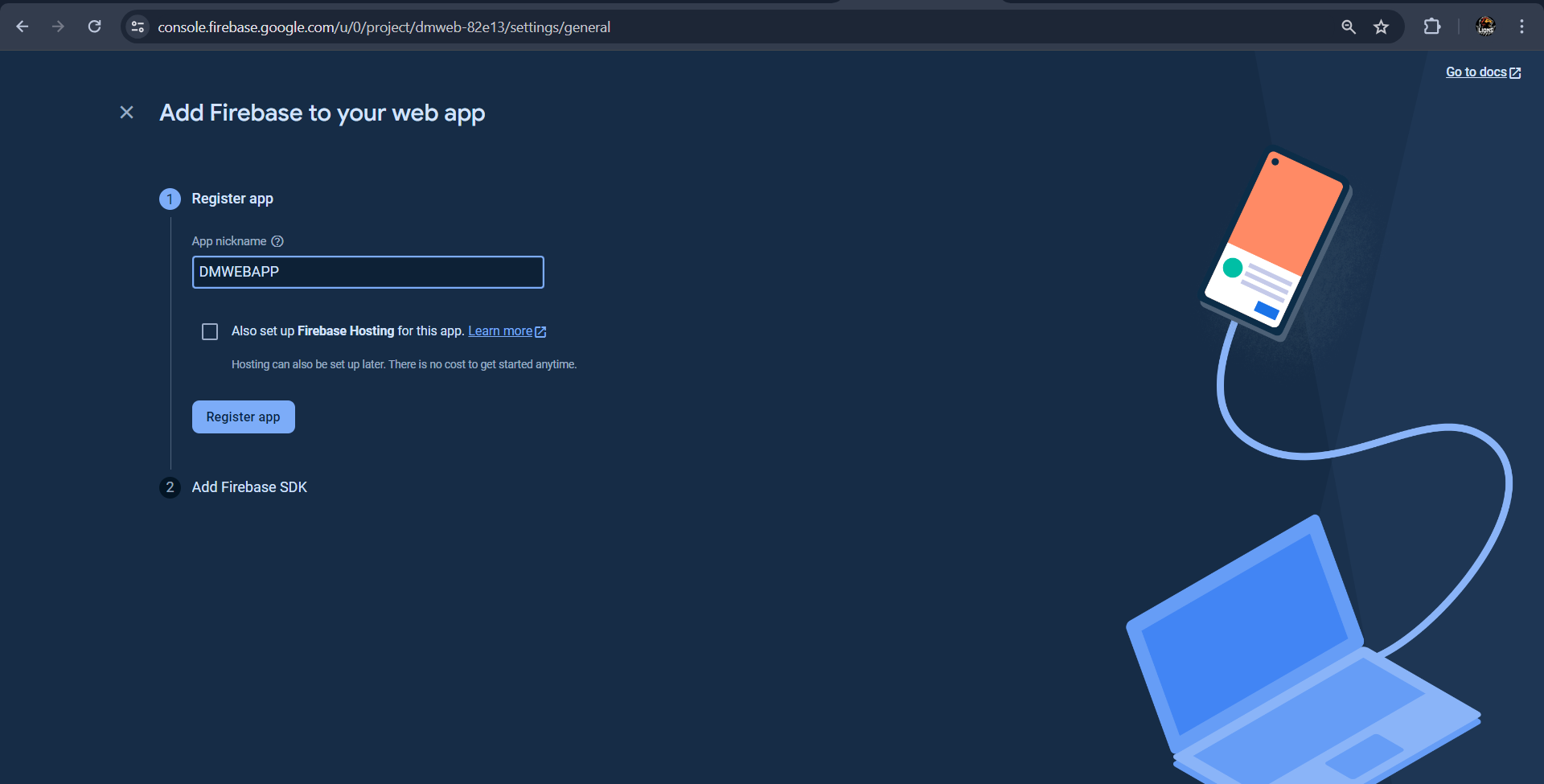 Next, give a name to the webapp (eg. DMWEBAPP ) and uncheck firebase hosting