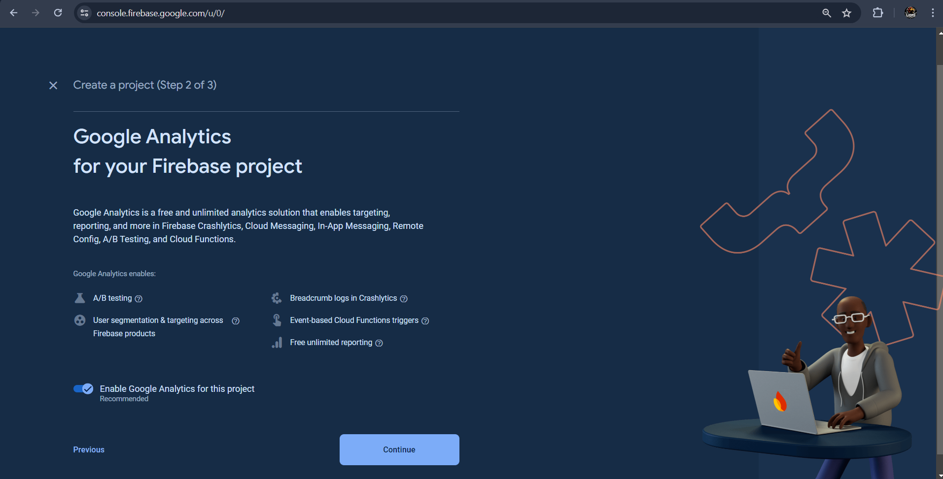 Enable Google Analytics and Click on Continue Button