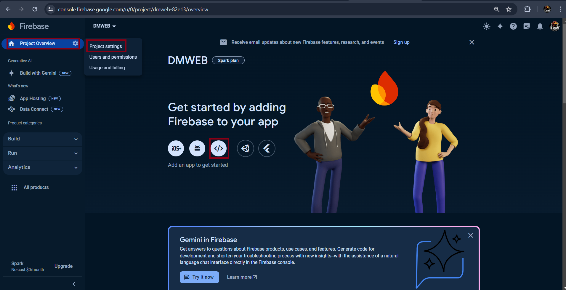 Once you are inside the Project console, click on the gear icon next to Overview and then on Project settings
